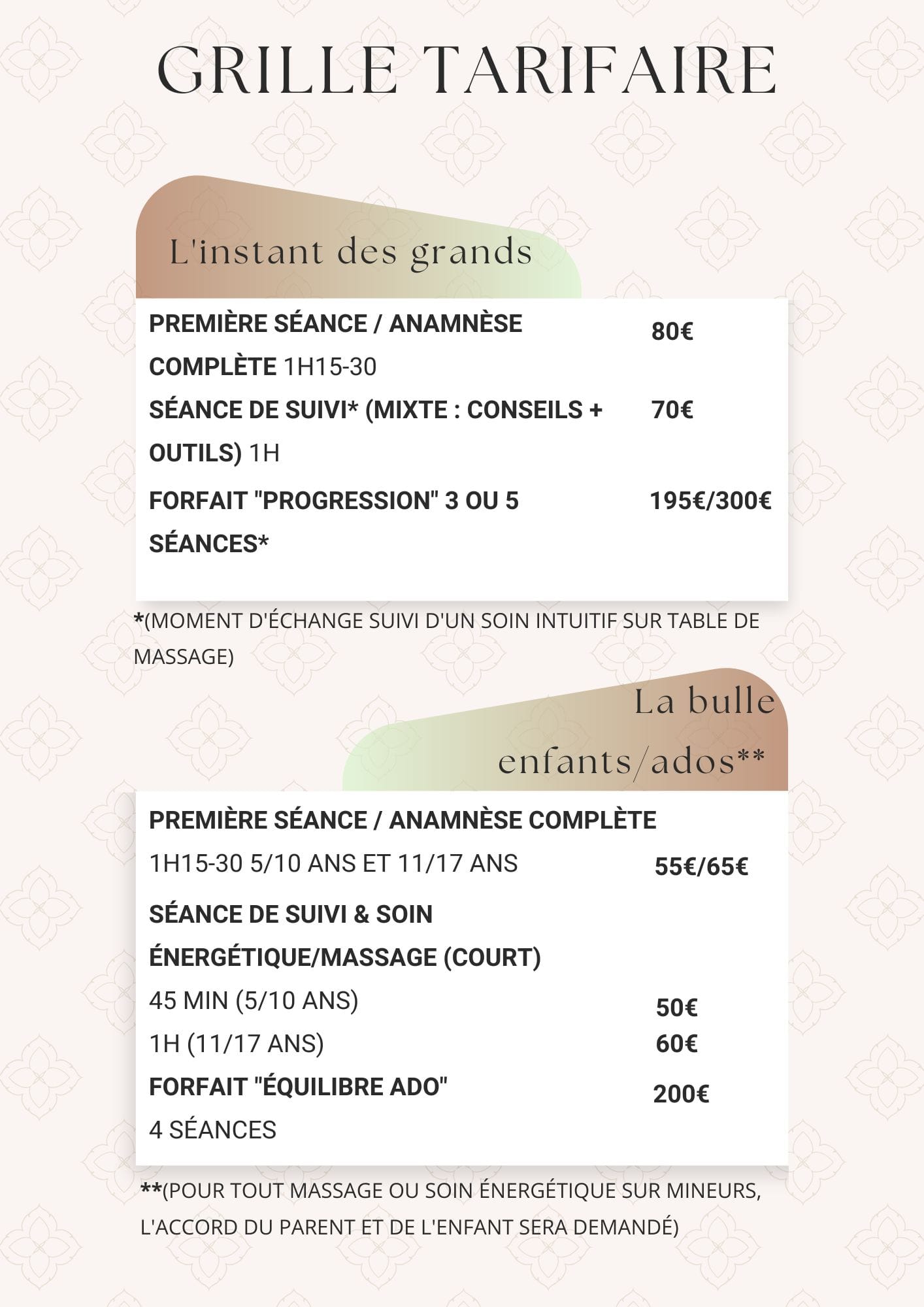 *(pour chaque prestation je prend volontairement le temps de vous recevoir, de vous écouter et de vous accueillir dans votre bulle de sécurité, je prévois 1h théorique mais prévoyez toujours de voyager hors du temps, assurez vous que vous n'ayez pas d'autre rendez-vous ou activité à la suite, pas le choix et vous avez un autre rendez-vous ensuite? On s'adapte, si c'est le cas n'hésitez pas à me le dire au début de la séance afin que j'organise mon temps pour votre bulle cocooning et que vous puissiez profiter de votre moment détente)